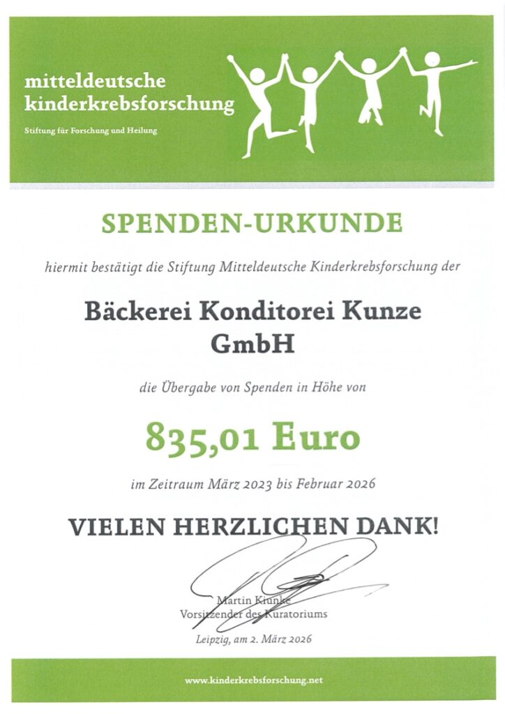 SPENDEN-URKUNDEHiermit bestätigt die StiftungMitteldeutsche Kinderkrebsforschung der Bäckerei Konditorei Kunze GmbHdie Übergabe von Spenden in Höhe…